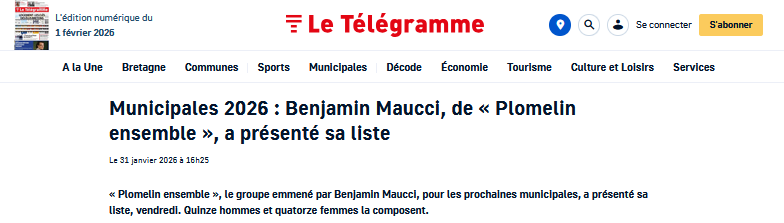 « Nous nous présentons avec une équipe associant l’expérience d’anciens élus et le dynamisme de nouvelles personnalités, 14 femmes et 15 hommes, de toutes générations et de tous milieux, mêlant actifs et retraités et habitants de différents quartiers de Plomelin, engagés par leurs mandats électoraux ou associatifs », a annoncé la tête de liste Benjamin Maucci. Une liste sur laquelle figurent plusieurs membres de l’opposition actuelle ainsi que l’ancien maire Jean-Paul Le Dantec.